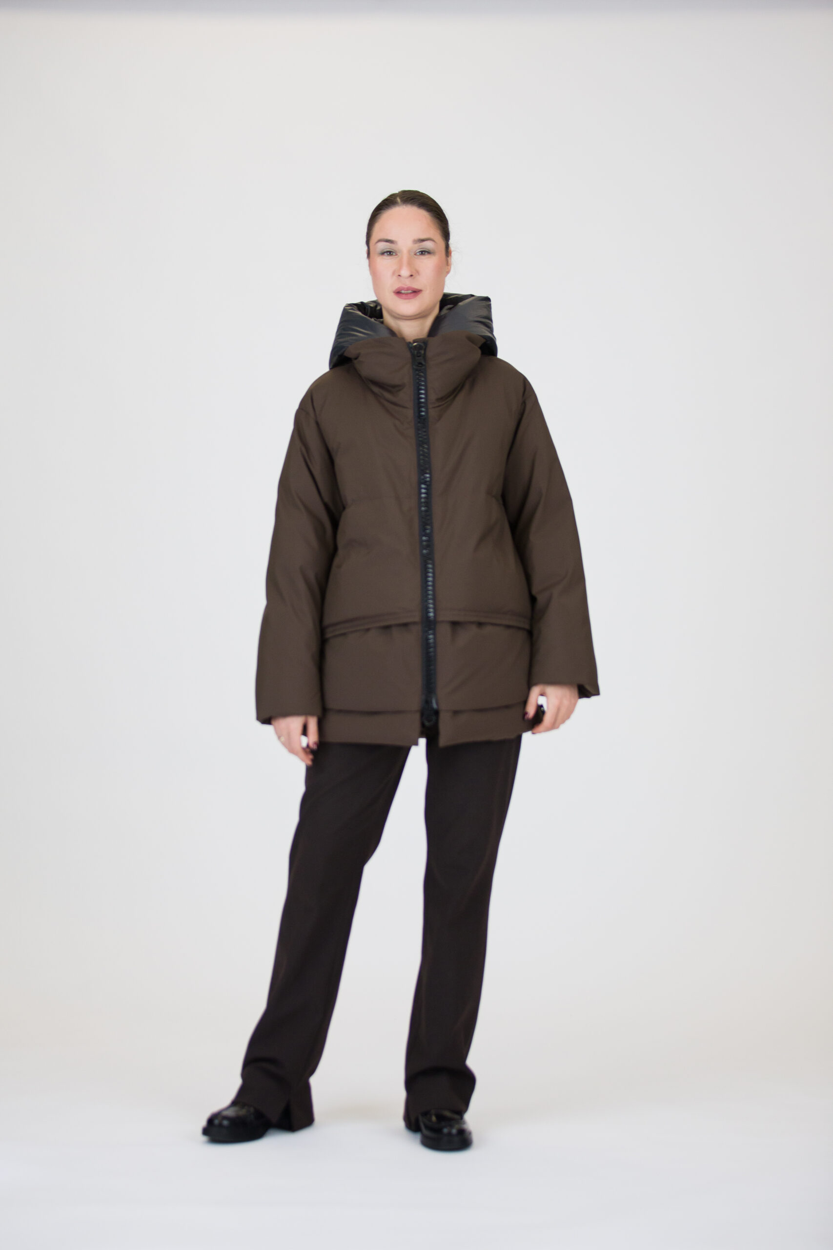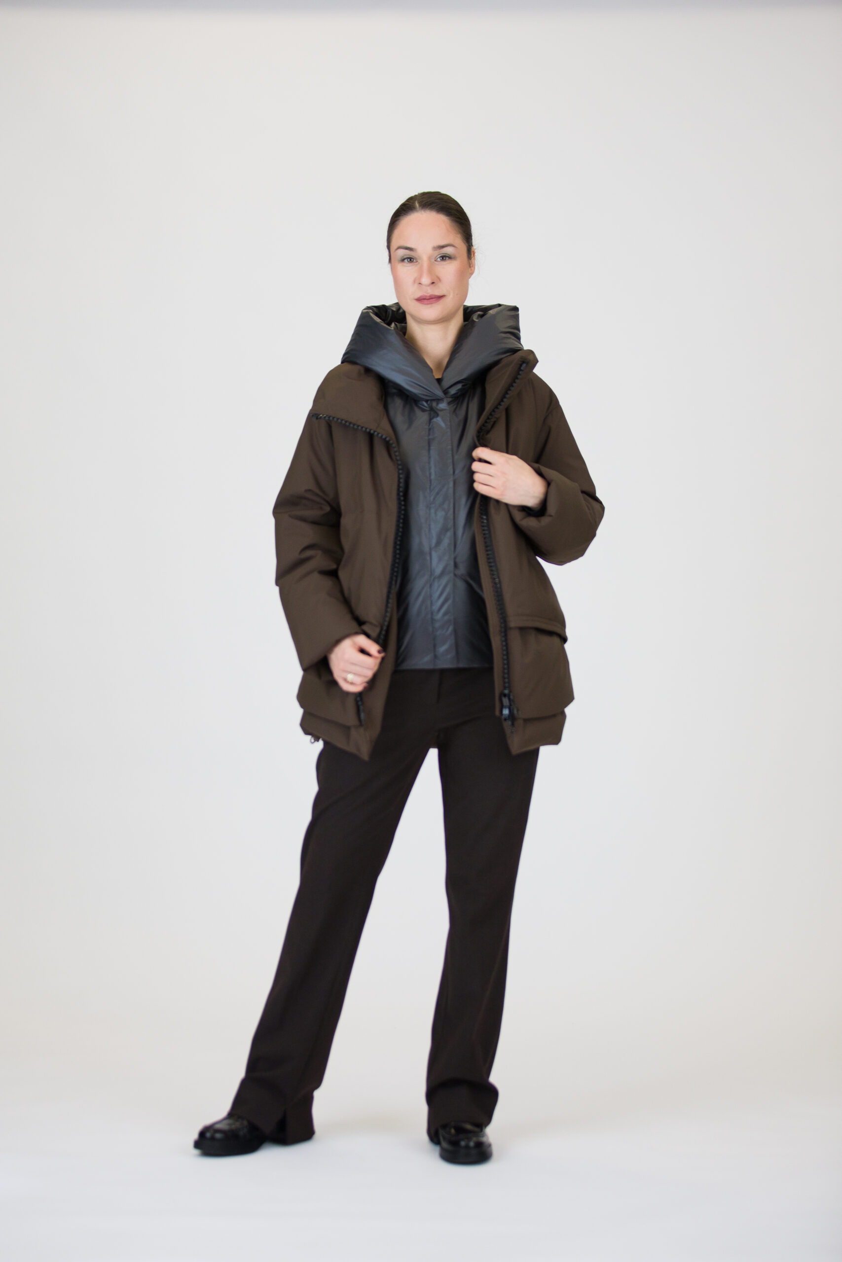 - užsegama dvipusiu užtrauktuku ir metalinėmis spaudėmis;
